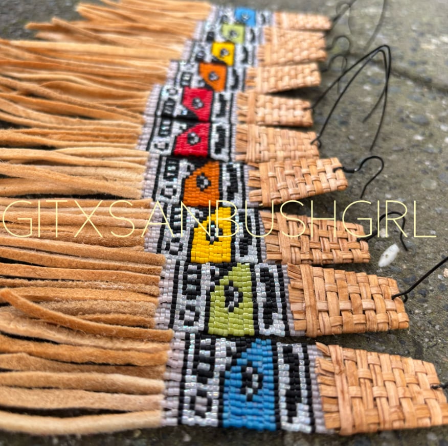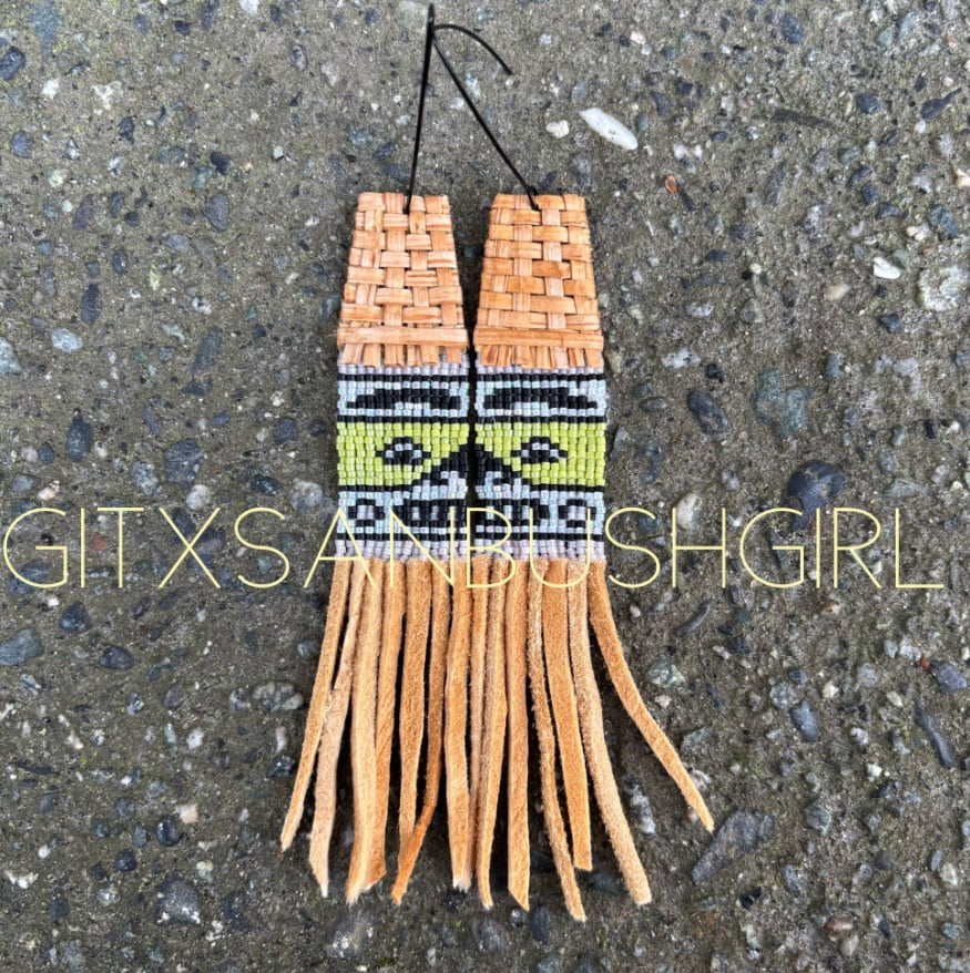 Sustainably, ethically & righteously harvested yellow cedar hats with smoked moose hide dangles :GBG: brick stitched ancestor faces ~ with our signature cheeks ✨
