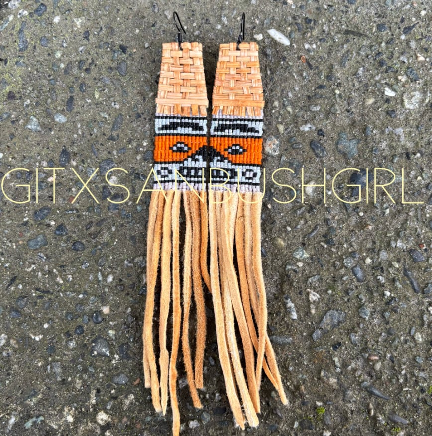 Sustainably, ethically & righteously harvested yellow cedar hats with smoked moose hide dangles :GBG: brick stitched ancestor faces ~ with our signature cheeks ✨
